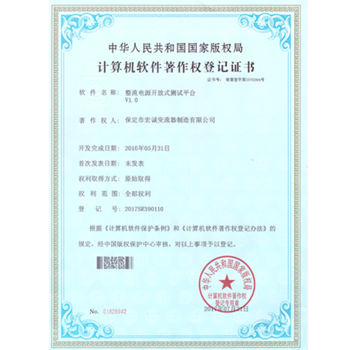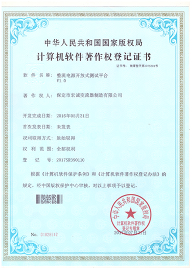 • 計(jì)算機(jī)軟件注冊(cè)權(quán)登記證書(shū)——整流電源開(kāi)放式測(cè)試平臺(tái)V1.0
