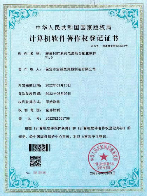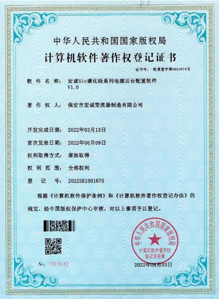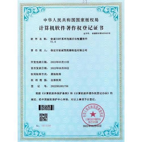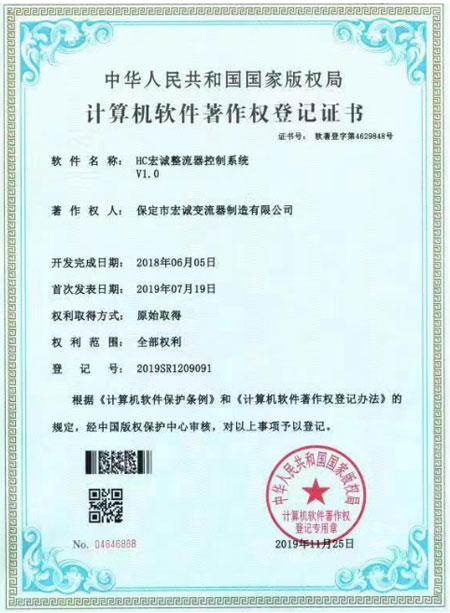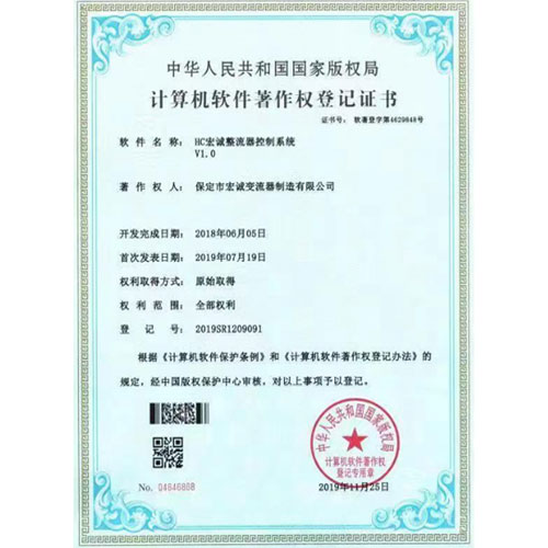 • 計(jì)算機(jī)軟件著作權(quán)登記證書(shū)--HC宏誠(chéng)整流器控制系統(tǒng)V1.0